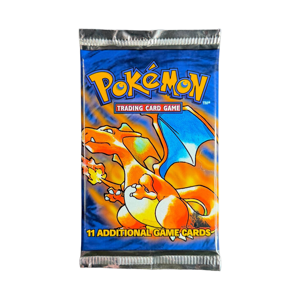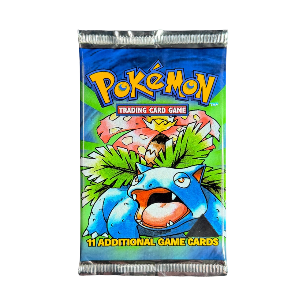 The Black Triangle error Base Set Booster Pack is a rare and collectible mistake from the early days of the Trading Card Game. These packs originally had a "1st Edition" stamp, but the stamp was covered with a black triangle to designate them as Unlimited Edition. The black triangle variant was produced for a short time, making them highly sought after by collectors due to their rarity and the historical significance of the production error. Despite the error, the cards inside are standard Base Set Unlimited cards.
